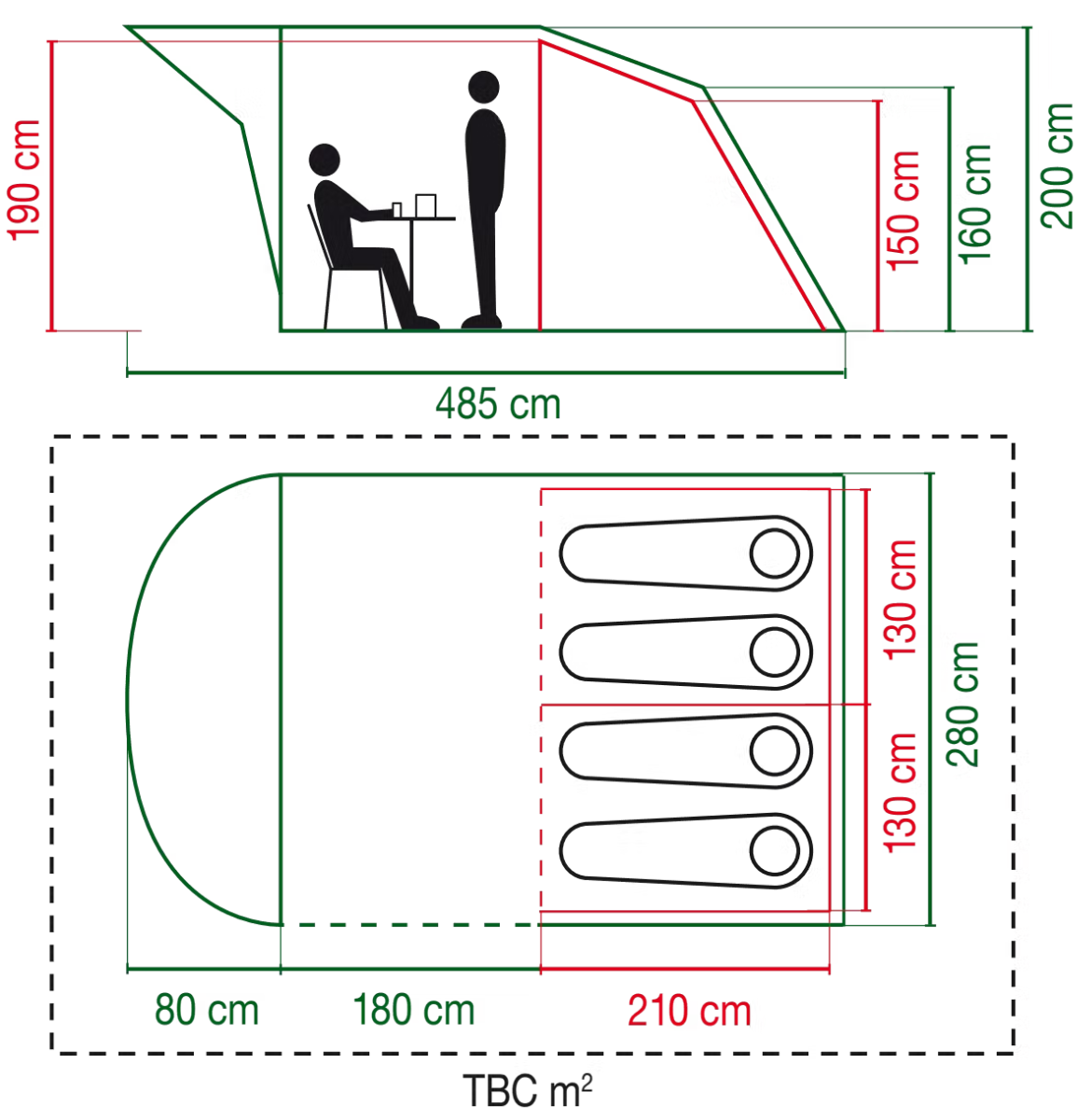 For additional versatility, eyelets are included in the side door to create a porch area (poles not included), providing extra storage or shelter. The fully waterproof and windproof design, coupled with rainskirts, ensures maximum protection against the elements.