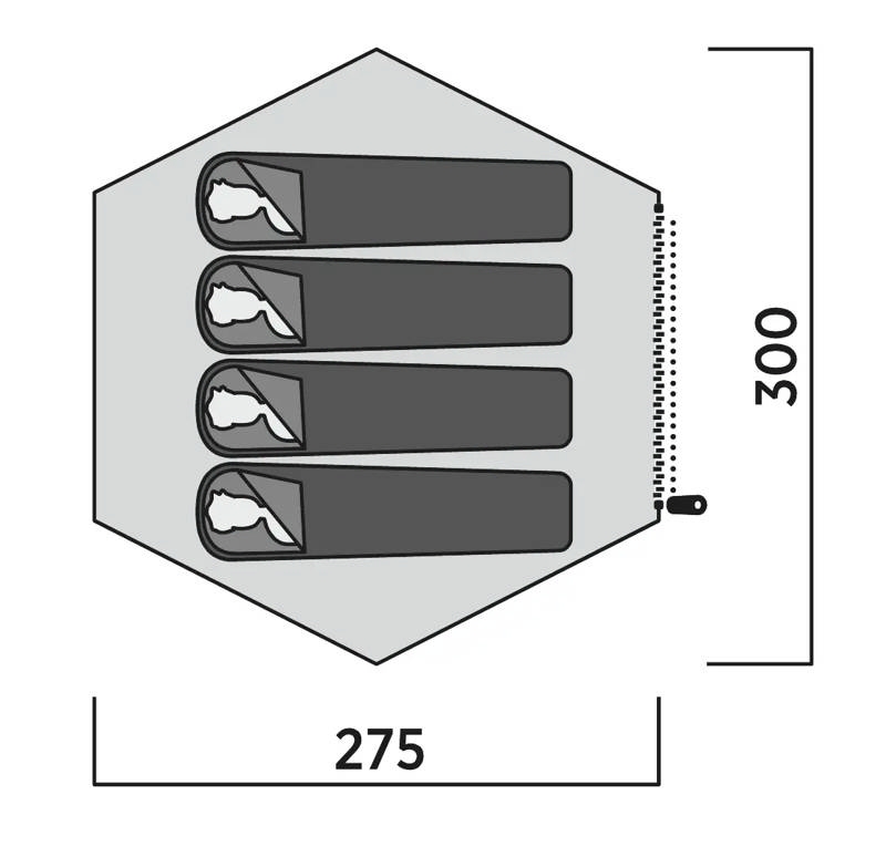 Art. No.: 120482 Barcode - Product: 5709388144553 Type of tent: Tipi Sleeps people: 4 Rooms: 1 bedroom Flysheet: WeatherGuard 3000, 190T polyester PU coated, fire retardant Type of groundsheet: Sewn-in groundsheet Hydrostatic Head: 3000 mm Taping: Taped seams Pitching way: In one Pitch time – ready to move in (minutes): 5 Pitch time – complete (minutes): 9 Weight: 5.5 kg Textile fiber composition: Flysheet: 100% polyester Mesh: 100% polyester Pack size: 62 x 19 cm Groundsheet: Polyethylene Poles: EnduraMax, steel 16 / 19 mm