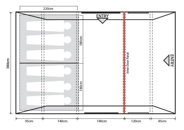A fully sewn-in groundsheet extends up to the inner door, providing added protection from the elements. The zip-back front door and window split 50/50, allowing for customizable ventilation and privacy. The right-hand side entry door with a zip-back mesh ventilation panel enhances airflow, ensuring comfort in warm conditions.