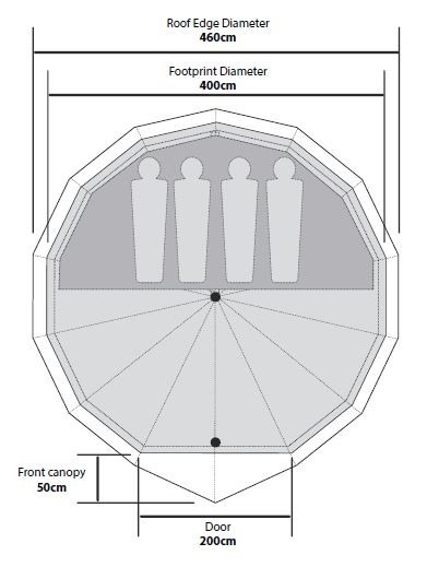 Designed for convenience, the Bell Star 400 features an extended front canopy, allowing extra sheltered space for relaxing or storing gear. The zip-back front door includes a zip-back mesh ventilation panel, optimizing airflow while keeping insects out. Additional zip-up side ventilation panels and lower rear vents with zip-down internal covers ensure enhanced air circulation, making the tent feel light and airy.