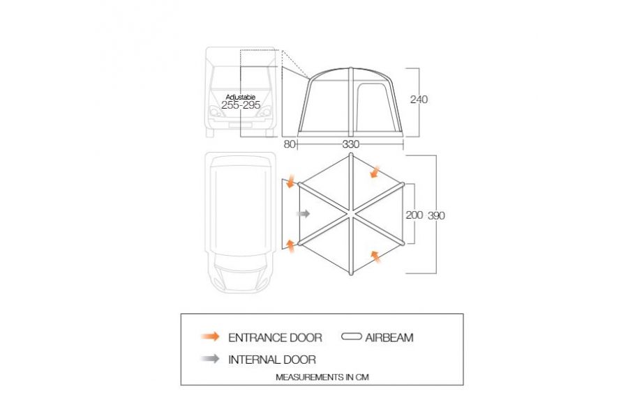 Easy Access Doors - A flat entry access door creates easy access for wheelchairs, prams and people with reduced mobility Pre-angled Beams - Achieve greater internal space than with a standard curve. Provides effective bracing against winds Easy Pack Carry Bag - Oversized carry bag to make it easier to pack the awning away Skylight Windows - Windows which run along the roof line of the awning to enhance light during the day and for stargazing at night Two Doors in Tunnel Attachment to Vehicle - For convenient access to the front or back of your vehicle Tunnel Adjustment Strap - Helps collect any excess material and creates a neater looking tunnel and a tighter fit to the vehicle Roll Away Connecting Tunnel - Detach your awning when you drive away for the day, simply roll back the tunnel and toggle it to secure Multiple Vehicle Attachment Methods - All our awnings come with pre-attached 6mm kador, 8M over vehicle straps, roof bar attachment tabs and sleeve for pole & clamp kit system. This ensures our awnings are compatible with any vehicle This awning has multiple additions available for enhanced functionality - Please check our additions table for more details Fully Wind and Rain Tested - Tested with wind and heavy rainfall to the European standard EN5912 Steel Rock Pegs Included - Pegs are strong, durable and can be used on more challenging terrain. Supplied with a handy carry bag Adjustable Pegging Points - Allows awning to be pitched perfectly on uneven surfaces