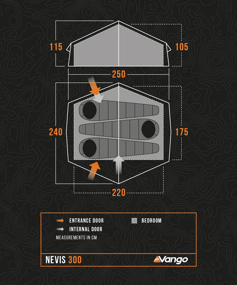 Inside, the breathable polyester inner tent and integrated mesh panels improve airflow and help manage condensation. Double inner doors allow easy access from either side of the sleeping area, while a single porch provides sheltered storage for boots and essential kit. Supplied with lightweight alloy pegs and a Fast Pack tent bag, the Nevis 300 packs down small for easy transport and is D of E recommended, meeting key expedition requirements for weight, durability, and ease of pitching.