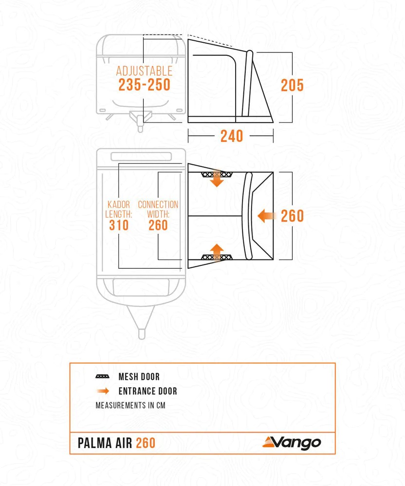 Thoughtful extras come as standard, including a draught skirt and wheel arch cover to block cold air, steel pegs and corner rock pegs for a guided first pitch, and webbing storm straps for rougher weather. The SkyTrack II rail with supplied hooks lets you hang lights and organisers exactly where you need them. With a pitching time of around 10 minutes, the Palma 260 keeps setup simple, so you spend more of the weekend unwinding. Adjustable height 235–250cm and a dual 4mm and 6mm kador ensure an easy, sealed connection to most caravans and wind-out canopies.